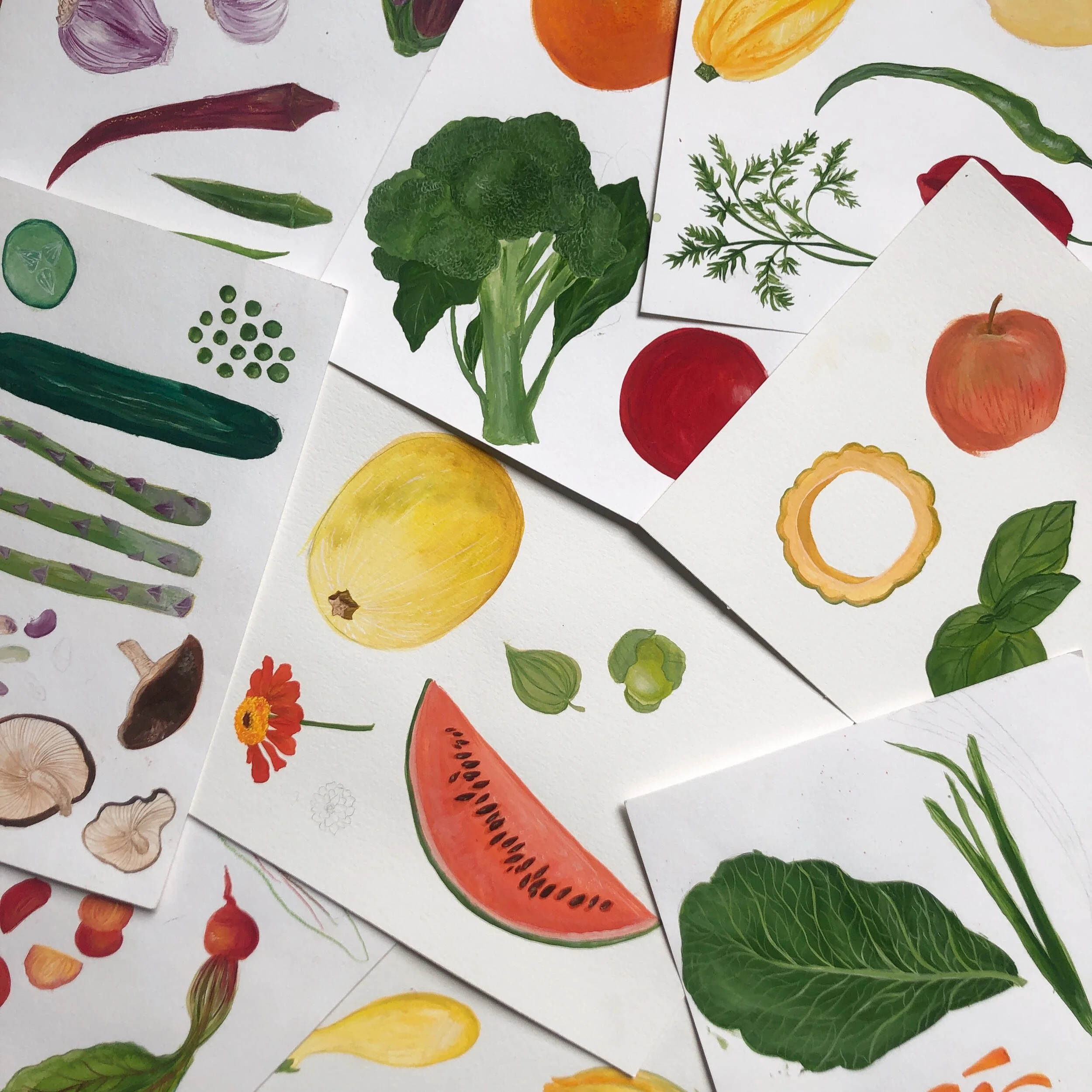 After some experimenting I decided that this project needed to be done with acrylic gouache- it really made the colors true to life and fulfilled the project needs best. I then hand-painted 50+ different fruits, vegetables, herbs, and flowers. Edited minor flaws and cut out in photoshop so the individual PNGs could be moved around the page seamlessly.