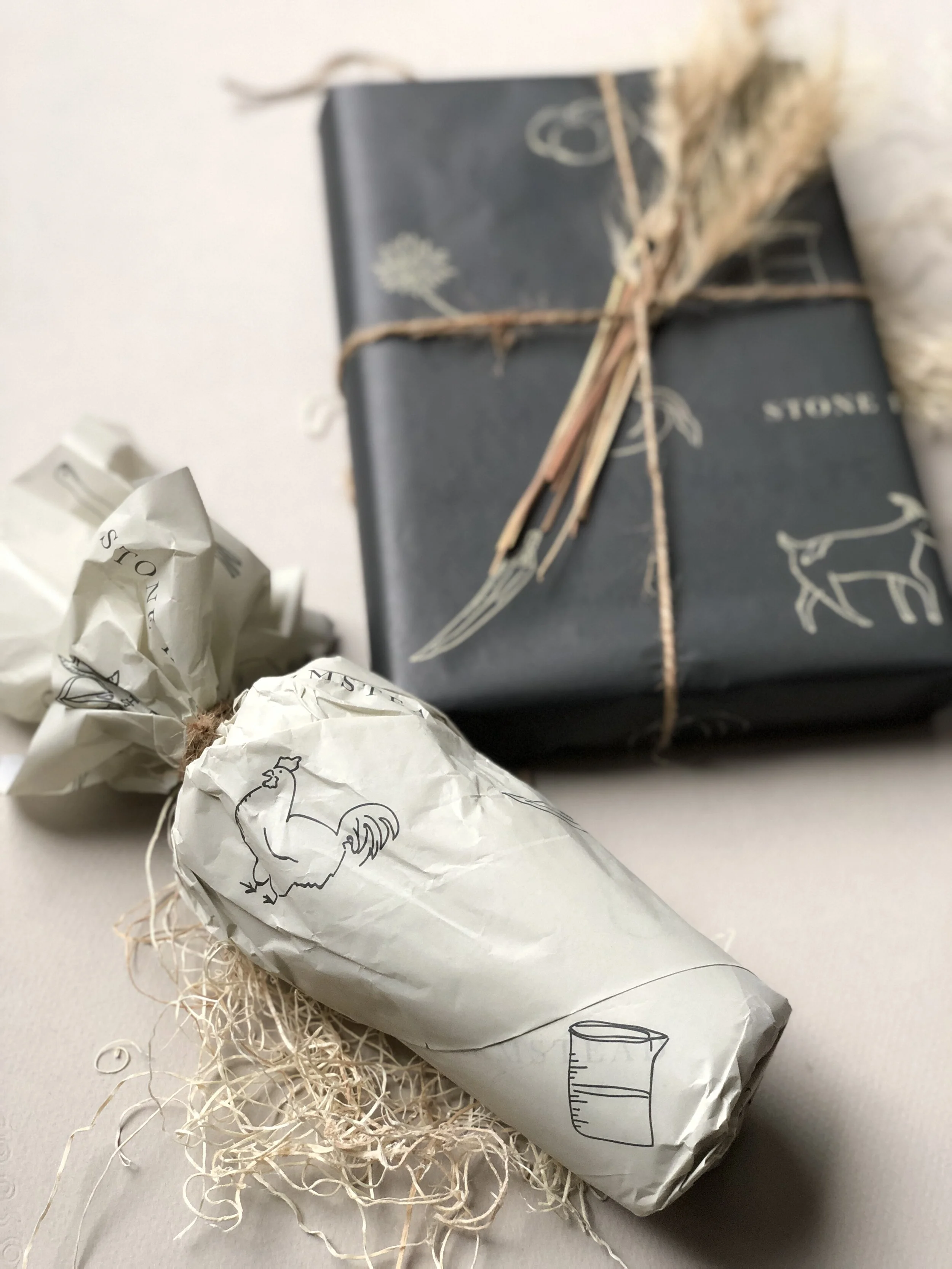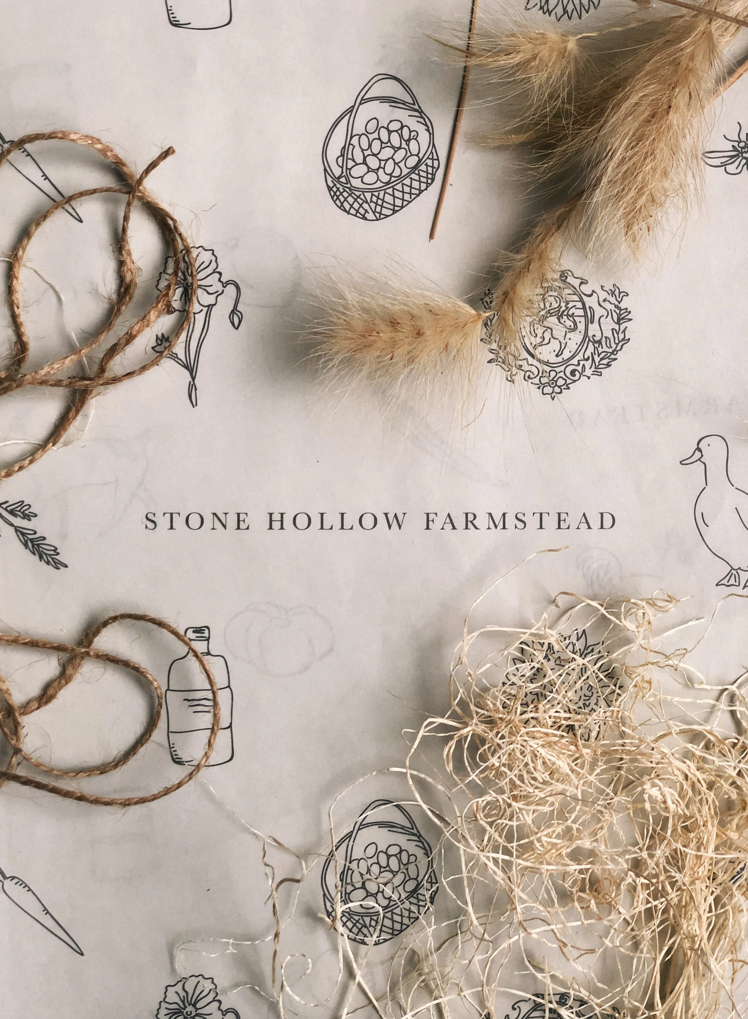 Designed for Stone Hollow Farmstead for their gift packaging. They do so many things at their farm I wanted to highlight as many special aspects as possible- I narrowed it down to 25 icons including: a goat, curly garlic scape, dahlias, basket of eggs, and more!