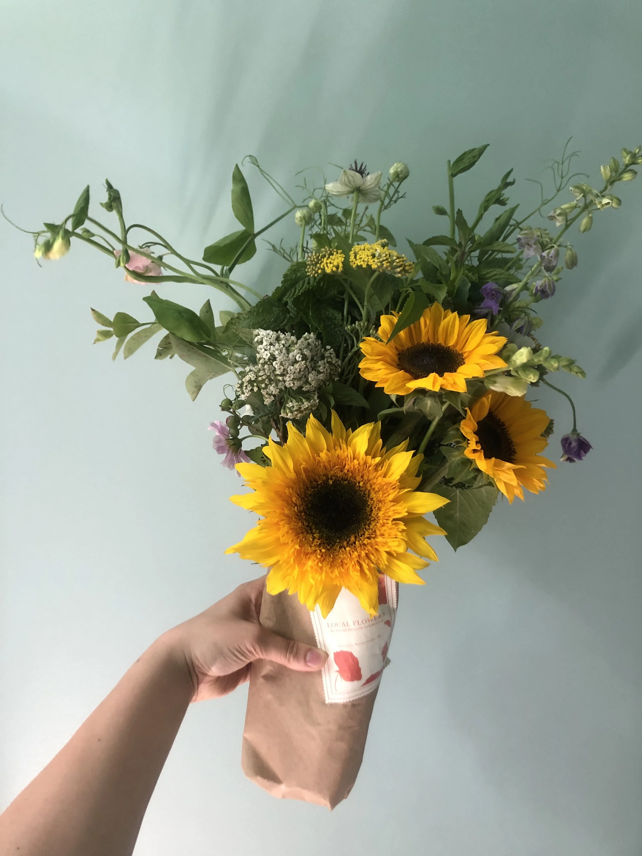 Featuring large happy sunflowers